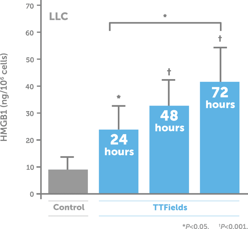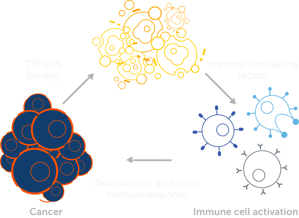 In preclinical models, TTFields have been shown to induce immunogenic cell death of cancer cells (e.g. release of HMGB1 from the nucleus, cell surface exposure of calreticulin, and autophagy-mediated ATP release), thus triggering an anti-cancer immune response