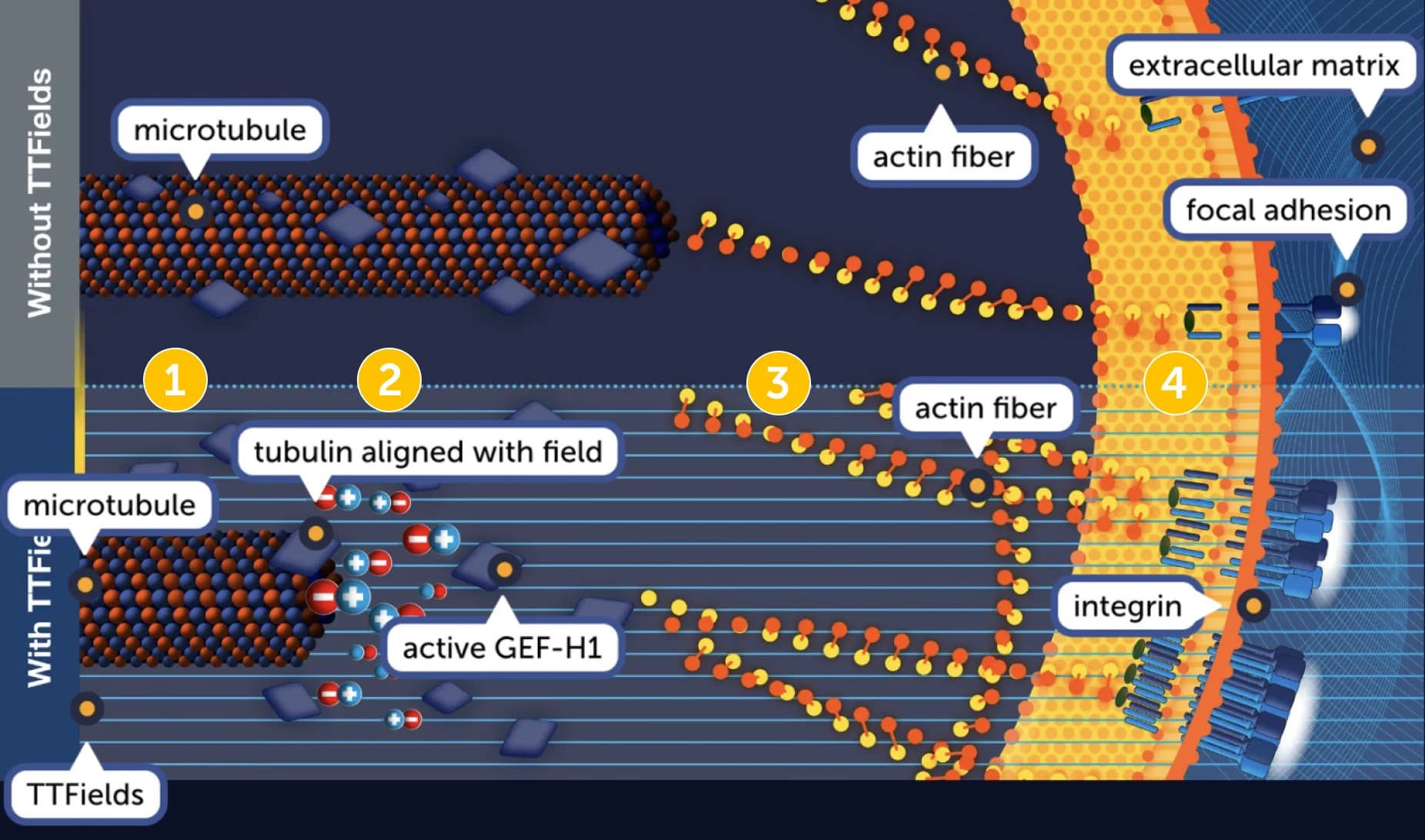 - TTFields exert directional forces on polar tubulins, leading to their alignment in the direction of the field. This in turn, leads to the reorganization of the microtubule network, and release of GEF-H1.